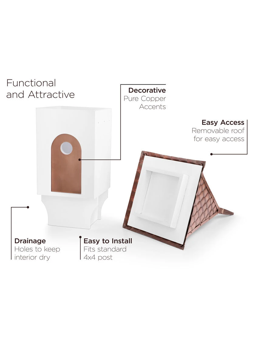 With an elevated peak, this house provides a comfortable retreat for your feathered-friends. The diamond-patterned copper roof and doorway While it attracts attention as an ideal outdoor accent, its removable copper roof offers the easiest access. Air vents circulate fresh air through the space and drainage holes are in the base. Equipped with a long-lasting mango hardwood base for enhanced durability and a bird-friendly 1.5” entry protected by a copper accent.